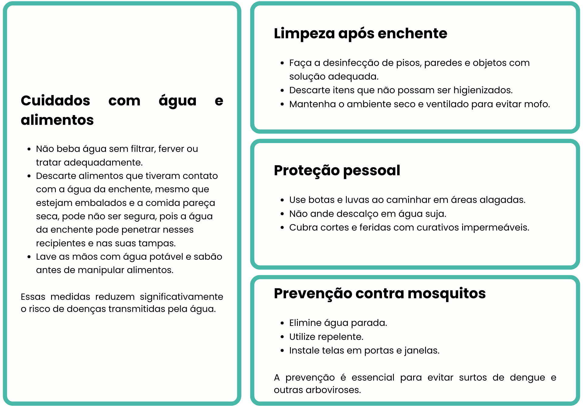 Os impactos das enchentes na saúde podem se prolongar por dias ou até semanas, especialmente quando não há limpeza adequada ou quando a população continua exposta à água contaminada.