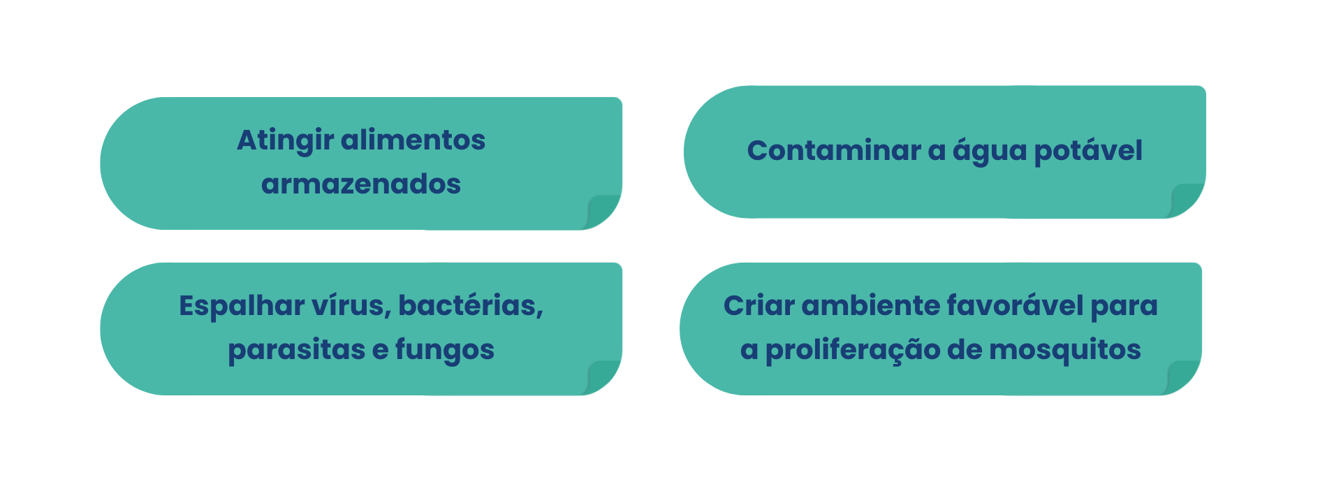 Mesmo após a água baixar, o risco continua. A água parada acumulada se torna criadouro de mosquitos transmissores de doenças, aumentando os problemas de saúde após enchentes.