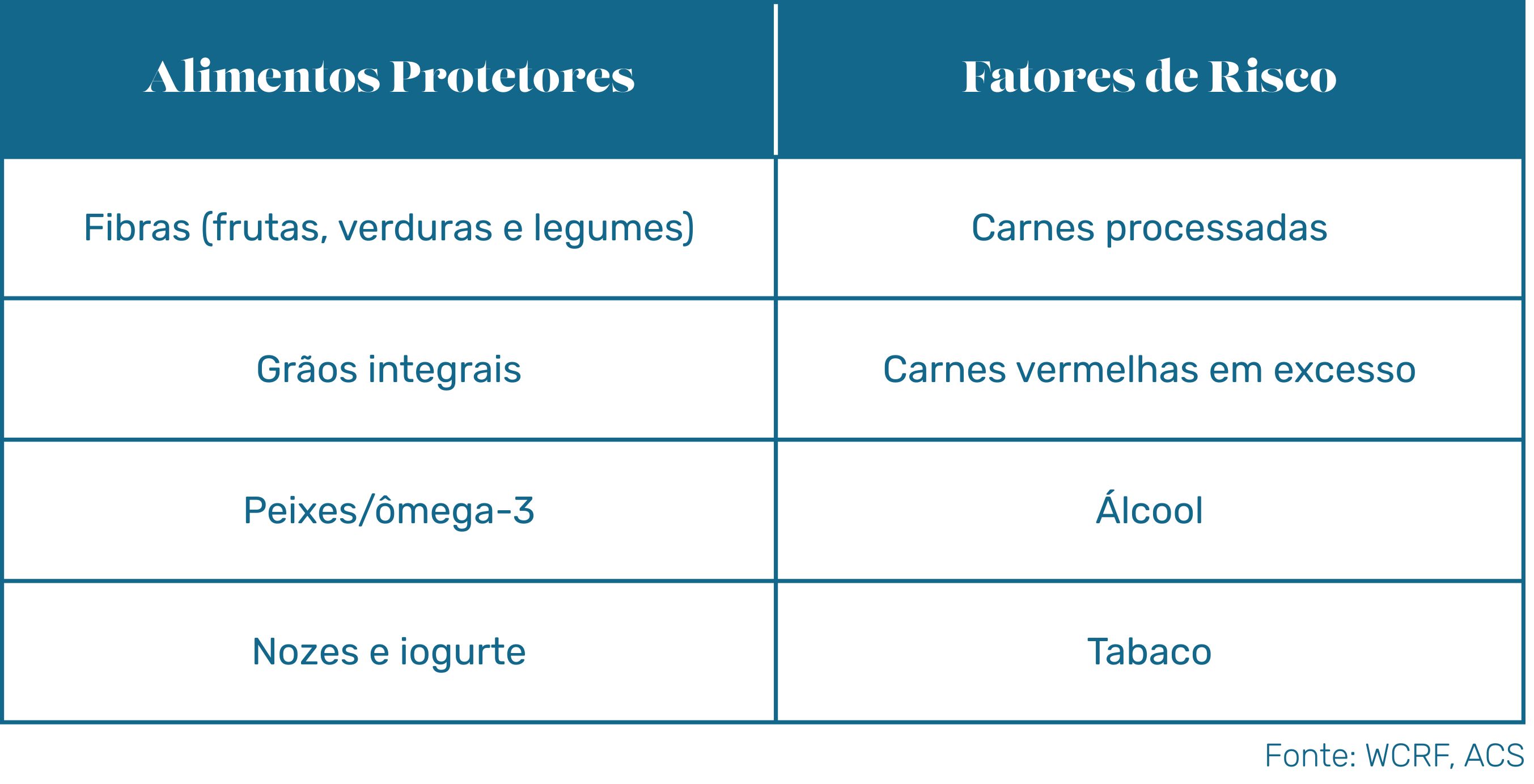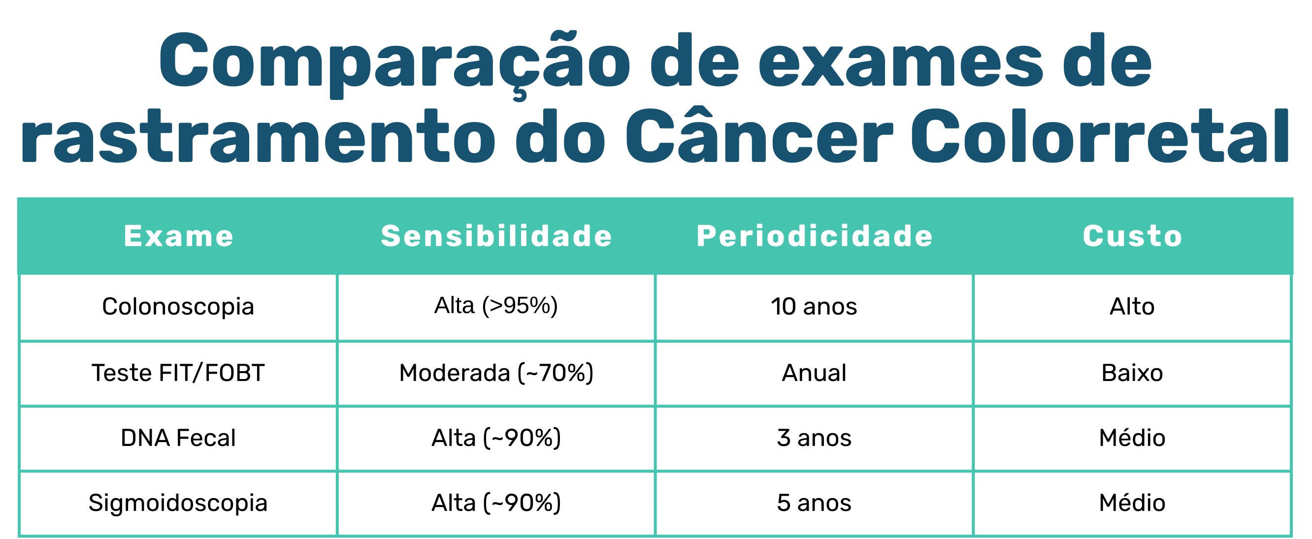 - Testes genéticos (casos de risco hereditário, como síndrome de Lynch ou polipose adenomatosa familiar).